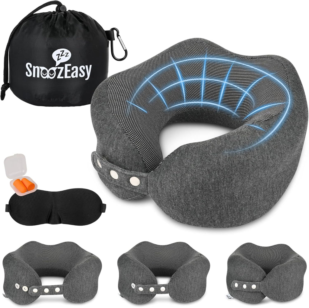 SnoozEasy™ Travel Pillow for Adults | High-Density Memory Foam Neck Pillow for Airplane | Adjustable Flight Travel Cushion with Eye Mask, Ear Plugs, Carry Bag & Carabiner Clip | UK Brand
