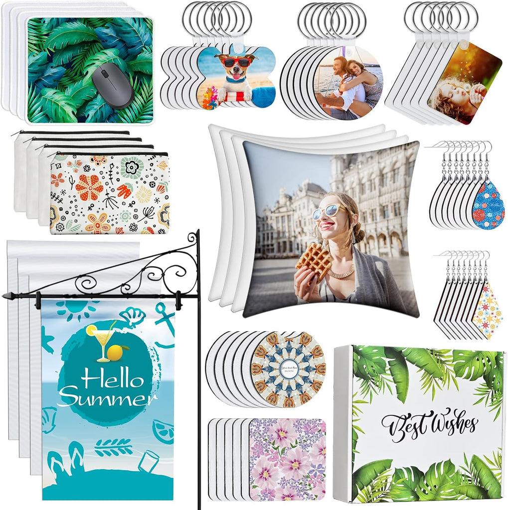 Sublimation Blanks Products 114pcs, Sublimation Blanks Set Including DIY Blank Makeup Bag, Keychain, Earring, Pillow Cover, Mouse Pad, Coaster, Garden Flag for Sublimation Transfer Heat Transfer Craft