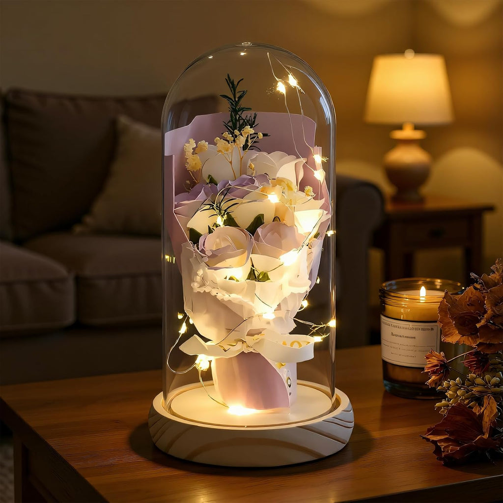 Birthday Gifts for Women - 7 Eternal Roses in Glass Dome with LED Lights | Luxury Artificial Flower Gift for Wife, Mum, Valentine's Day, Anniversary, Wedding, Home Decor, Real Wood Base