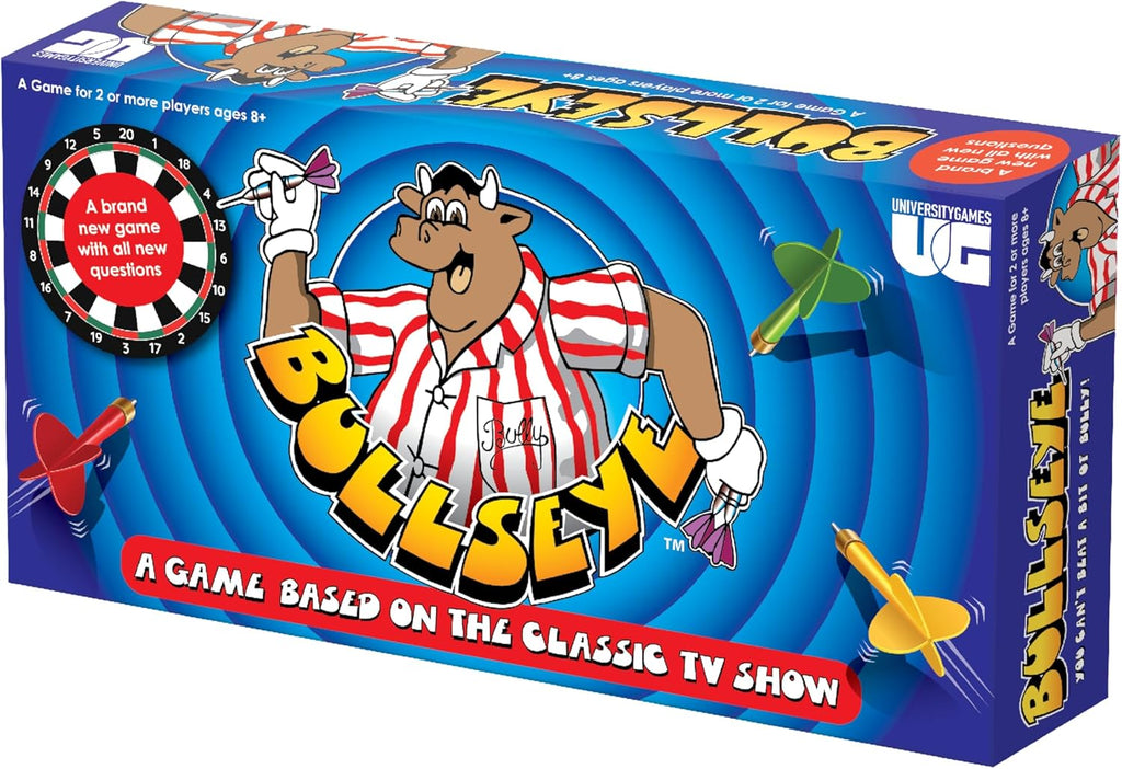 Bullseye Board Game, Classic TV Show Quiz with Magnetic Darts, Ages 14+, 2-8 Players, Blue